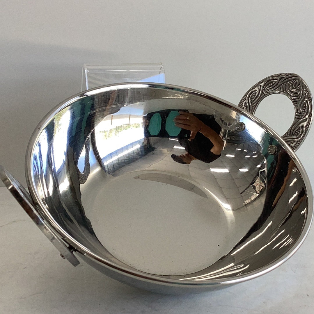 STAINLESS STEEL HAMMERED SERVING KADAHI BOWL WITH 2 HANDLES.