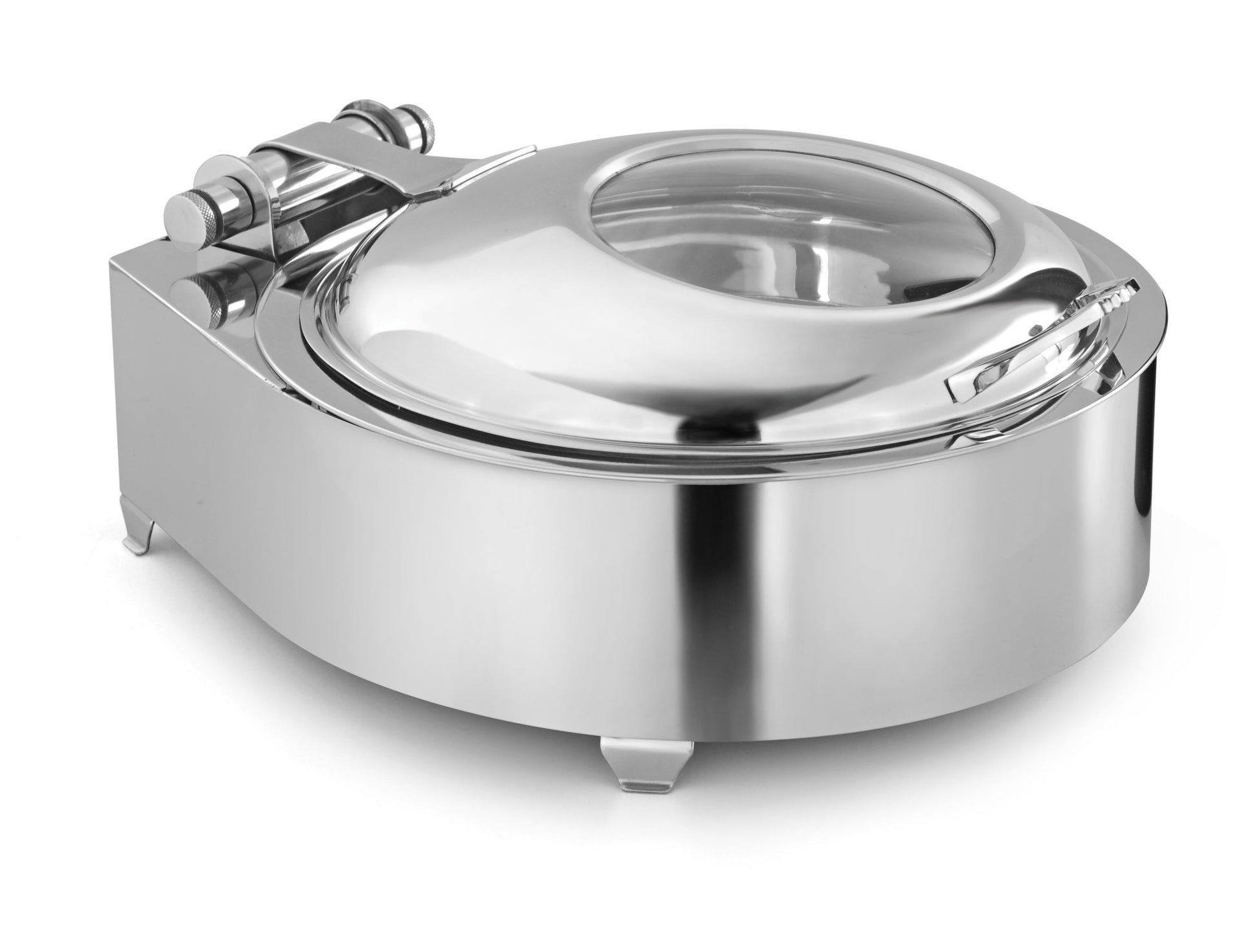 Round Chafer With cover control mechanism. With Glass Window. With fully closed stand. Short Height. Can be used only with Heating Plate. (Heating Plate Included)