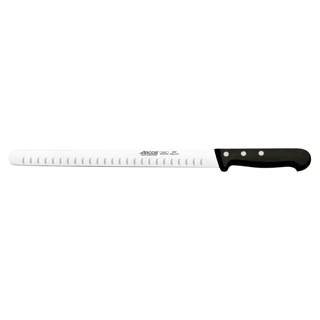 WIDE SERRATED BLADE. BLACK HANDLE. POLYOXYMETHYLENE (POM) HANDLE.